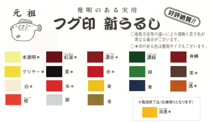 ③新うるし「本透明」は無鉛塗料となっておりますが、色を含むものに関しては顔料に有害な物質が含まれています。